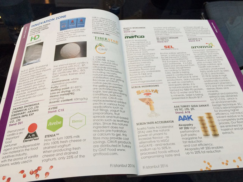 5月4~6日,公司派員參加了在伊斯坦布爾舉行土耳其食品配料展。展會(huì)期間接洽了來自土耳其、敘利亞、伊朗、埃及等國家的客商,展會(huì)會(huì)刊在醒目位置為公司免費(fèi)宣傳推介久珠品牌香蘭素產(chǎn)品,進(jìn)一步擴(kuò)大了公司產(chǎn)品的國際市場知名度。