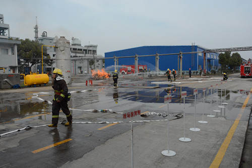 本次演練分為技能表演賽和事故演練兩個部分。技能表演賽由本公司專職消防隊員參加實施,內(nèi)容包括:“原地佩戴空呼器、水帶出水實操、著消防服堵漏”三個消防技能項目;事故演練部分內(nèi)容分為“車間制冷工段液氨泄露事故應(yīng)急救援演練”和“生產(chǎn)車間火災(zāi)事故應(yīng)急救援演練”兩個項目,演練人員由南湖區(qū)消防大隊、大橋鎮(zhèn)、中華化工專職消防隊三支訓(xùn)練有素的消防隊伍組成,中華化工企業(yè)職工、南湖區(qū)安監(jiān)局、環(huán)保局等相關(guān)工作人員共計50余人參加了事故應(yīng)急救援演練。